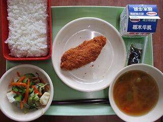 〈メニュー〉ごはん 牛乳 白身魚フライ こんぶづけ じゃがいもとさやえんどうの味噌汁