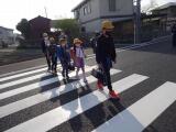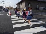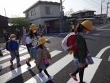 1年生にとって、お兄さんお姉さんと一緒に登校するのは初めてです。班長さんが、1年生の歩くペースに合わせてくれたので、安心して安全に登校することができました。学校の東側では、交通量が多く、同じ時間帯に自転車で通学する中学生も通るので、交通指導員さんや旗当番の保護者の方々のおかげで安全を確保しています。