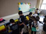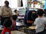 教室では、ランドセルから荷物を出して、机の中に整理したり、ロッカーにランドセルをしまったりします。6年生が、1年生教室に来て、やさしく手伝ってくれました。もちろん、自分でやりたいという子もいますが、困ったときに頼りにできるという安心が見られました。