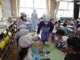 給食当番さんや調理員さんに感謝して、いただきますのあいさつをしました。感染予防対応として、おかわりは先生方が量を調節して配っています。