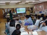 子どもたちは、図書室で説明の画面を見ながら、いろいろなことを知りました。市の図書館の蔵書数を知ったときは、大きな声を出すほどおどろいていました。