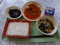 【ふるさとメニュー】ごはん ぎゅうにゅう とりにくのねぎトマトのソース くろまめのにもの ゆばのすましじる