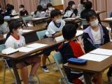 感染症予防のため、食べるときは別室で前向きになって食べました。5年生にとっては初めての調理実習でしたが、栄養教諭の先生や複数の先生方、地域のボランティアの方々のおかげで、とてもスムーズに行うことができました。(写真は、1~4組の学習の様子です。)
