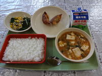 ごはん ぎゅうにゅう マーボーどうふ やきギョウザ ゆで野菜サラダ