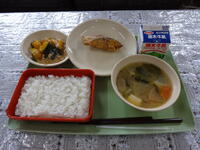 今年度、最後の給食です。この一年間、給食をしっかり食べられましたか。また、マナーを守って給食の準備や後片付けができましたか。みなさんの体は、これからもどんどん成長していきます。しっかり食べて元気な体をつくりましょう。春休み中も規則正しい生活をして、新学期を元気に迎えましょう。