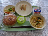 今日は、栃木市産の米粉を使った米粉パンです。米粉を使ったパンは、もちもちした食感が楽しめます。香りのよい米粉パンを味わって食べましょう。米粉パンには、炭水化物が多いので私たちの体の中でエネルギーになる働きがあります。