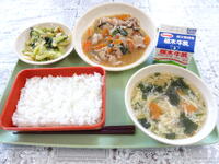 ごはん ぎゅうにゅう ぶたにくのスタミナいため こまつなのおひたし ちゅうかふうかきたまじる