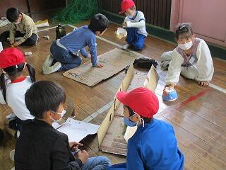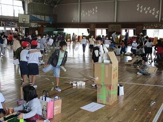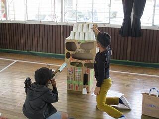 ◎2年生が1年生を招いて、「おもちゃフェスティバル」を開きました。2年生の生活科「うごくうごくわたしのおもちゃ」の学習で、段ボールや紙コップ、ラップの芯などの材料を工夫して組み合わせ、手作りのおもちゃを製作しました。学習の発表の場として、体育館に1年生を招いて、実際におもちゃで遊んでもらいました。