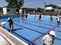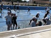 プールには、いろいろな部分があって、たくさんの仕事がありました泳ぐところ(水槽)、階段になっているところ、プールサイド、水が流れる溝、シャワーコーナー、水道・・・など、仕事の仕方を考えながら、ある時は友達と知恵を出し合い、またある時は先生に相談しながら、掃除を進めていきました