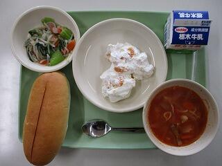 〈メニュー〉コッペパン 牛乳 フルーツクリームサンドの具 チンゲンサイのソテー ミネストローネスープ