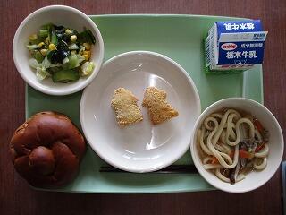 〈メニュー〉ミニ黒パン 牛乳 いかナゲット 煮込みうどん 海藻サラダ