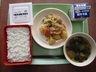 〈メニュー〉ごはん 牛乳 麦納豆 肉じゃが 大根とわかめの味噌汁