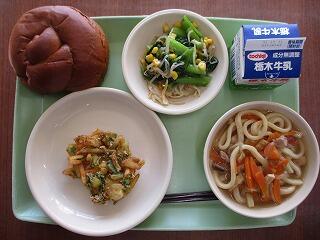 〈メニュー〉ミニ黒パン 牛乳 きのこうどん エビイカ入りかき揚げ 小松菜とコーンのサラダ