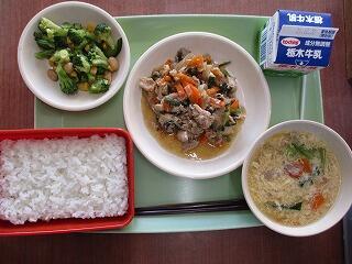 ごはん 牛乳 肉野菜炒め 大豆とブロッコリーのサラダ 卵と小松菜のスープ