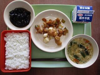 〈ふるさとメニュー:くろまめ〉ごはん 牛乳 焼き鳥風煮 黒豆煮 ニラ玉汁