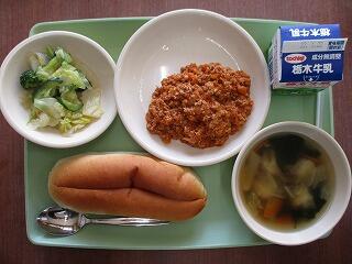〈メニュー〉コッペパン 牛乳 ミートサンドの具 茹で野菜サラダ 洋風卵スープ