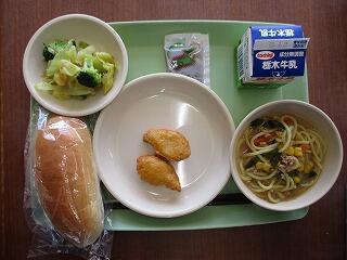 〈メニュー〉バターロール 牛乳 フライドチキン 茹で野菜サラダ 白菜スープ