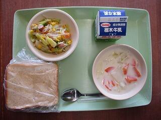 〈メニュー〉コッペパン 牛乳 フルーツクリームサンドの具 チンゲンサイのソテー ミネストローネスープ