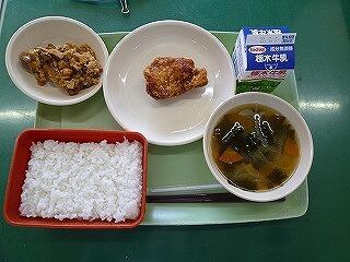 〈メニュー〉ごはん 牛乳 鶏肉の唐揚げ しもつかれ じゃがいもとわかめの味噌汁