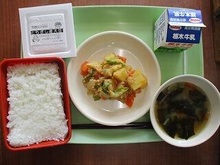 〈メニュー〉ごはん 牛乳 カレー肉じゃが 麦納豆 白菜とわかめの味噌汁