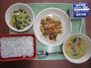 〈メニュー〉ごはん 牛乳 ガパオライスの具 ゆで野菜サラダ チンゲンサイと卵のスープ