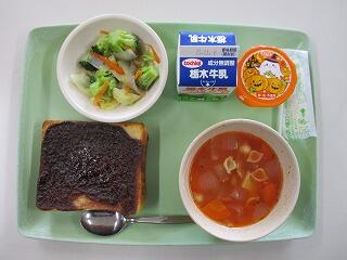 コッペパン 巨峰ジャム 牛乳 鶏肉の宮ねぎトマトソース 野菜サラダ パンプキンスポタージュ