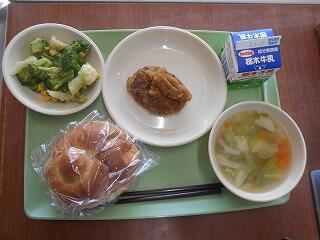 〈メニュー〉ココアあげパン 牛乳 ヘルシーサラダ チキンビーンズ