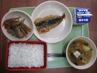 〈メニュー〉ごはん 牛乳 あじフライ 大豆の磯煮 小松菜の味噌汁