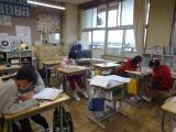 ボランティアさんが来られない学級では、担任の先生が読み聞かせをしています。子どもたちは、いつもと違う先生の雰囲気を感じながら楽しんでいました。