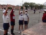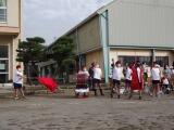 はじめに、全体で出発式の練習をしました。司会の子どもの進行に合わせて、挨拶や礼の指導をしました。練習とはいえ、しだいに姿勢がよくなり、真剣さが出てきました。