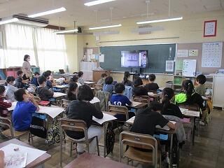 ☆とちぎコープの講師の方は、多目的室からお話しをしていただき、3年生児童は、各教室から大型テレビを通して、お話を伺いました。