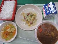 は、ポークカレー、キャベツとウィンナーのソテー、マスカットのジュレポンチです