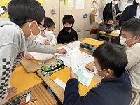 迷っている子には、先生が机間を回りながら、個別に支援していきました。物語を読み進めながら、がまくんとかえるくんの姿で、共感できた部分を思い起こしながら記入していました。これまでのワークシート集が、とても有効な資料になっていました。