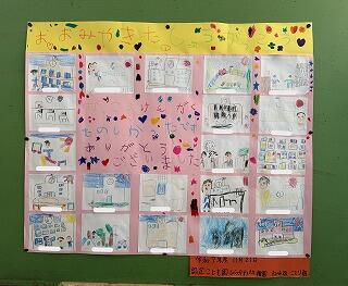園長先生からのお礼のお手紙と、子どもたちからの作品が届きましたので、早速階段の踊り場に掲示しました。