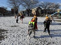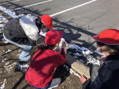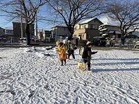 2年生には、シャベルを使用させるには危険と判断し、6年生がシャベルを使用して雪をかき出し、その雪を2年生がプラスチックの雪かきスコップで運びました