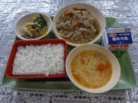 今日は、栃木市のおいしい食材を使った「とち介ランチ」です。栃木市産の豚肉とたまねぎを使ったしょうが焼きと、トマトを使ったスープです。トマトは、JAしもつけのトマト部会の生産者の方が給食のために無償で提供してくれました。生産者の方に感謝し、味わっていただきましょう。とち介ランチについてちょこっと食通信を見てください。
