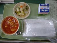 今日は、コッペパンにミートサンドの具をはさんで食べてください。また、今日のスープには、ひよこ豆が入ったスープです。豆には、植物性のたんぱく質が豊富です。