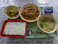 ごはん ぎゅうにゅう マーボーはるさめ キムチあえ ワンタンスープ