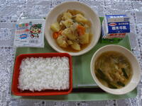 ごはん ぎゅうにゅう ドライカレーのぐ やさいスープ りんごのジュレポンチ