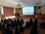 はじめに、保健委員会の子どもたちから、学年のアンケート結果を発表しました。お酒やタバコが体に与える影響についても考えている子どもがたくさんいることがわかりました。