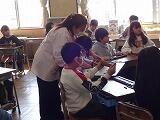 4階から見学を始め、音楽室では1年生の授業の様子を見ることができました。1年生と同じように鍵盤ハーモニカの指の動きを確かめるお子さんもいました。5年生の授業では、一人一台タブレット端末を活用している様子、外国語科で英語でコミュニケーションしている様子、図書室ではたくさん本があることを見て驚いていました。