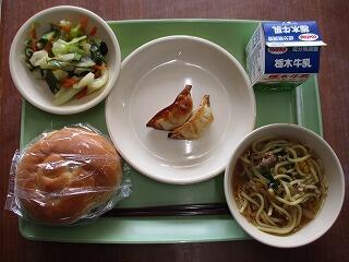 〈メニュー〉ミニしろいんげんロールパン 牛乳 ギョウザ にらラーメン 海藻サラダ