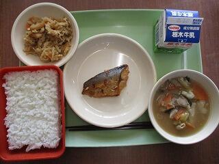 〈メニュー〉ごはん 牛乳 さばのスタミナ焼き 切り干し大根の煮物 きりたんぽ汁