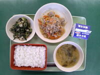 ごはん ぎゅうにゅう しょうゆこうじのやきにくどんのぐ いそかあえ こまつなのみそしる