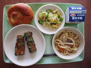〈メニュー〉こめこパン 牛乳 ちくわの磯辺揚げ かんぴょう入りサラダ 煮込みうどん