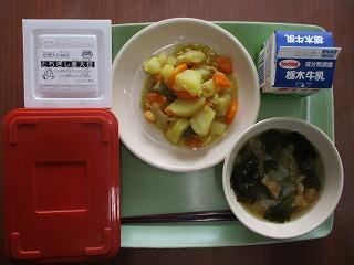 〈メニュー〉ごはん 牛乳 カレー肉じゃが 麦納豆 白菜とわかめの味噌汁