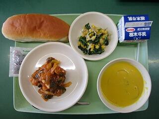 コッペパン 巨峰ジャム 牛乳 鶏肉の宮ねぎトマトソース 野菜サラダ パンプキンスポタージュ