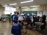 次に、1・4・6年生は、窓ガラスのないところへの避難をしました。2・3・5年生は、教室で机でシェルターを作り、その下に避難しました。