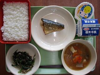 〈メニュー〉ごはん 牛乳 鯖の塩焼き 味噌けんちん汁 小松菜のいそか和え 十五夜デザート