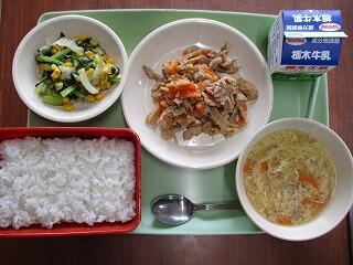 〈メニュー〉ごはん 牛乳 ビビンバの具 チンゲンサイと卵のスープ 野菜サラダ